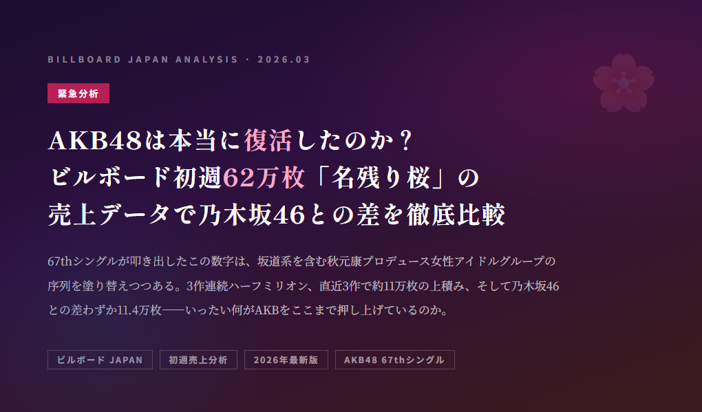 2016年に乃木坂46がAKB48を年間売上で逆転。なぜ差がついたのか、なぜAKB48は盛り返しつつあるのか。オリコン・ビルボードの実データをもとに、2つのグループのビジネスモデルの違いから読み解く考察記事。